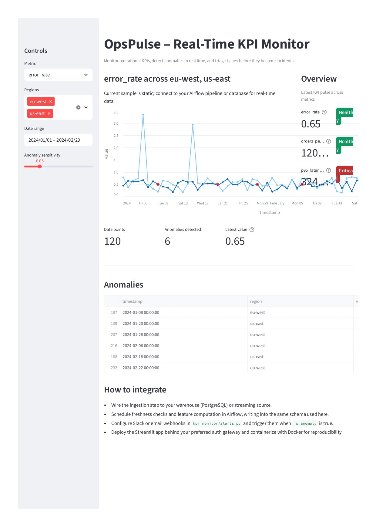 OpsPulse is a Python-based web dashboard and helper library for real-time KPI anomaly monitoring. It focuses on operational metrics (KPIs) and uses a machine-learning anomaly detector to flag unusual behavior before it turns into an incident. The project combines: